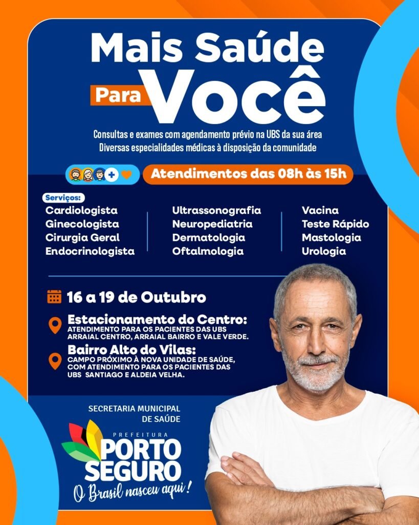 A Prefeitura de Porto Seguro, por meio da Secretaria Municipal de Saúde, promove entre os dias 16 e 19 de outubro a 4ª edição do programa Mais Saúde Para Você, desta vez no distrito de Arraial d’Ajuda. A iniciativa oferece consultas médicas especializadas, exames e serviços, fortalecendo o compromisso do município com a promoção da saúde e o cuidado humanizado.