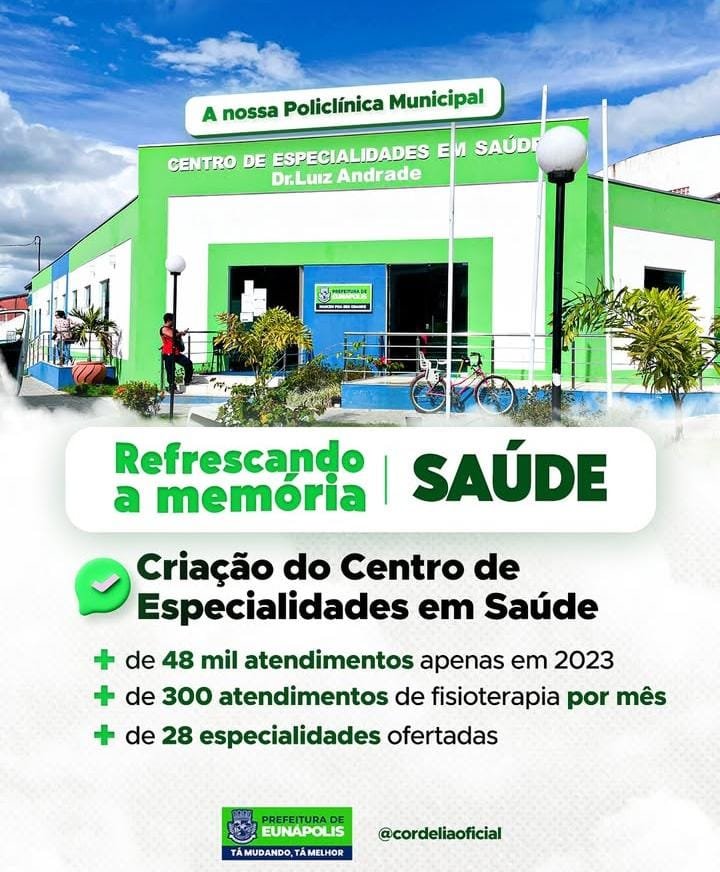 Inaugurado em 25 de julho de 2022, pela ex-prefeita Cordélia Torres, o Centro de Especialidades Dr. Luiz Andrade, localizado na Policlínica Municipal de Eunápolis, tornou-se um importante pilar para a saúde da população local. Com uma estrutura moderna de 880 metros quadrados, a unidade oferece atendimento em mais de 20 especialidades médicas, garantindo que os eunapolitanos tenham acesso a cuidados de qualidade sem precisar se deslocar para outras cidades.