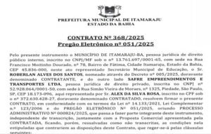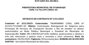 Em Itamaraju, a Transmimo Ltda. (CNPJ nº 45.523.719/0001-45) assinou, em 20 de maio de 2025, o Contrato nº 233/2025, no valor de R$ 3.483.815,69, para o transporte escolar da rede pública municipal e estadual.