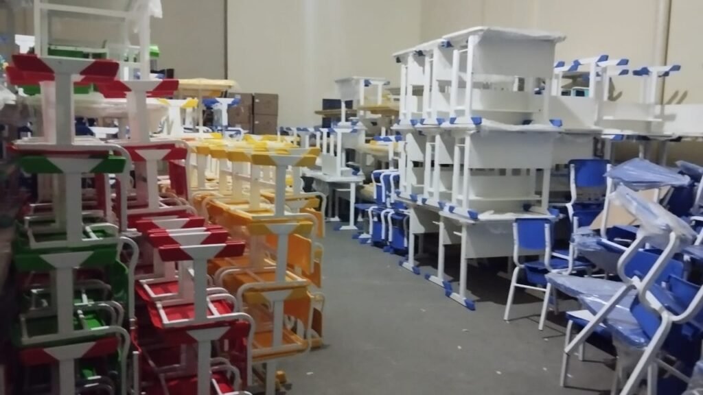 Entre os mobiliários, voltados para professores e estudantes, estão conjunto de mesas e cadeiras, carteiras universitárias, conjuntos sextavados, conjuntos trapézio, arquivos, armários, prateleiras e conjuntos para refeitório adulto e infantil.