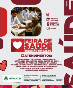 Amanhã, **quarta-feira, 5 de novembro**, a comunidade de **Ribeirão do Salto** receberá a **Feira de Saúde**, uma grande ação promovida pela **Prefeitura de Itarantim**, por meio da **Secretaria Municipal de Saúde**, em parceria com as secretarias de **Assistência Social**, **Cultura, Turismo e Juventude**, a **Procuradoria Geral do Município** e o **Conselho Tutelar**.