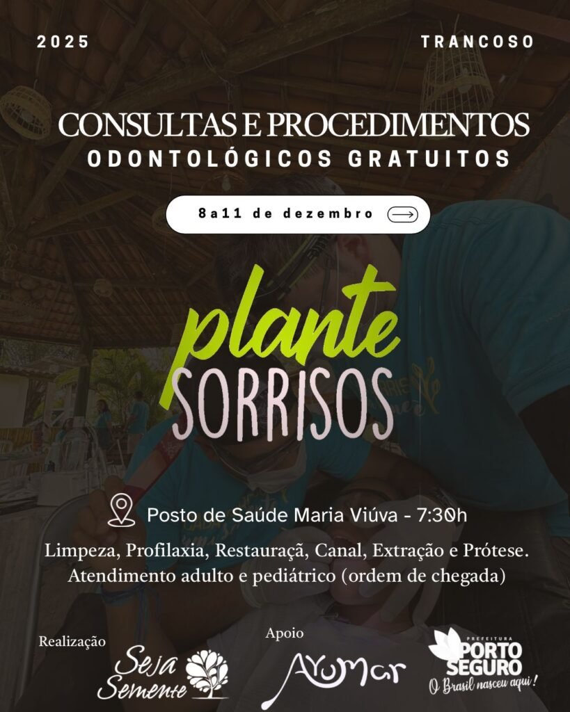 Entre os dias 8 e 11 de dezembro, Trancoso recebe a ação Plante Sorrisos, na Unidade de Saúde do Maria Viúva, a partir das 7h30, que vai oferecer consultas e procedimentos odontológicos gratuitos à população.