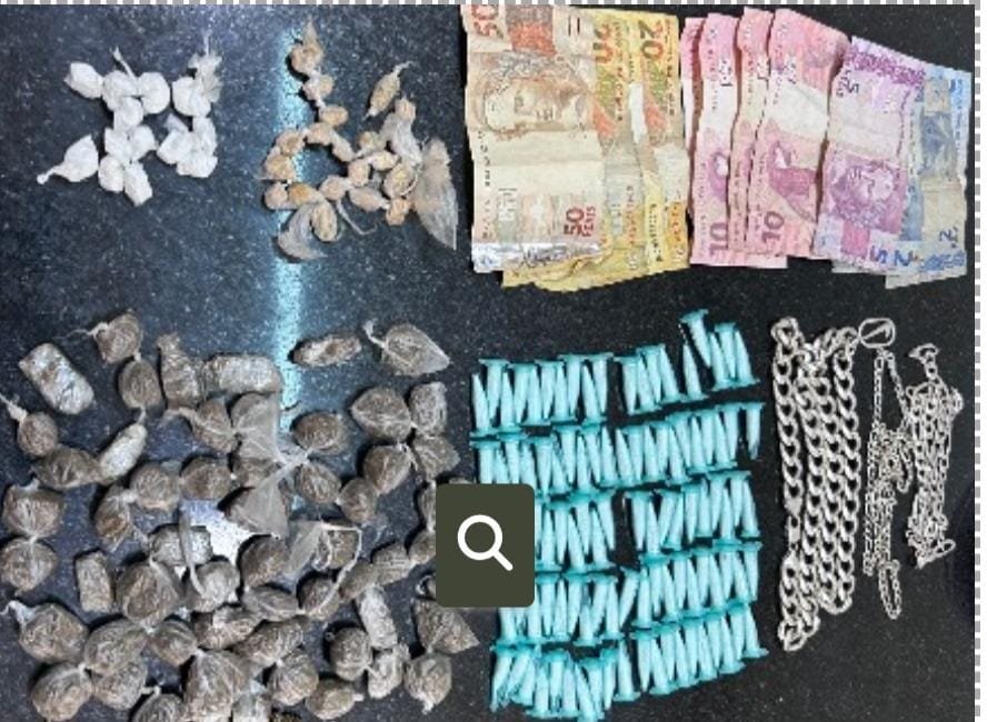 100 pinos de cocaína 80gr, 13 trouxinhas de cocaína 9 gr, 23 pedras de crack 10 gr, 63 buchas de maconha 102 gr, 3 correntes de prata e 181 reais em dinheiro.