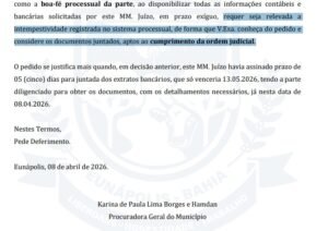 A Prefeitura de Eunápolis voltou ao centro de uma grave polêmica após a Procuradora-Geral do Município protagonizar mais um vexame institucional: perdeu o prazo fixado pela Justiça em um processo envolvendo esclarecimentos sobre recursos milionários do Fundo Municipal de Saneamento e depois precisou pedir ao juiz que aceitasse a manifestação atrasada.