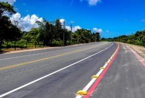 A pista de rolamento também segue recebendo nova pintura de sinalização horizontal, com faixas centrais e laterais, além da instalação de dispositivos refletivos, conhecidos como “olhos de gato”, que aumentam a visibilidade, principalmente durante a noite e em condições de baixa luminosidade.