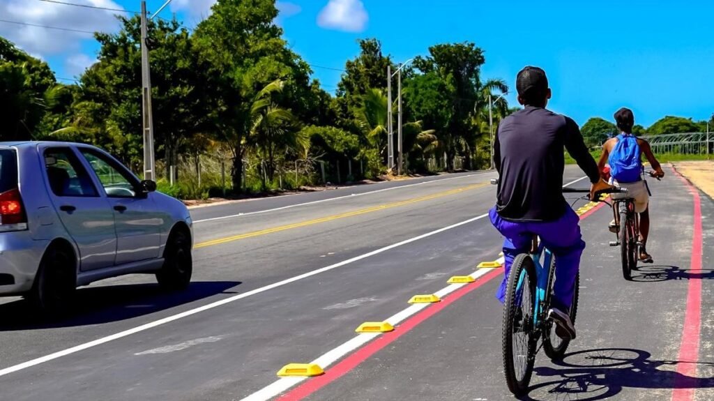 Nesta etapa, a ciclovia já está demarcada com cores específicas, garantindo melhor visibilidade e organização do espaço. Além disso, foram instalados tachões refletivos que fazem a separação entre a ciclovia e a pista, oferecendo mais proteção para ciclistas e pedestres.